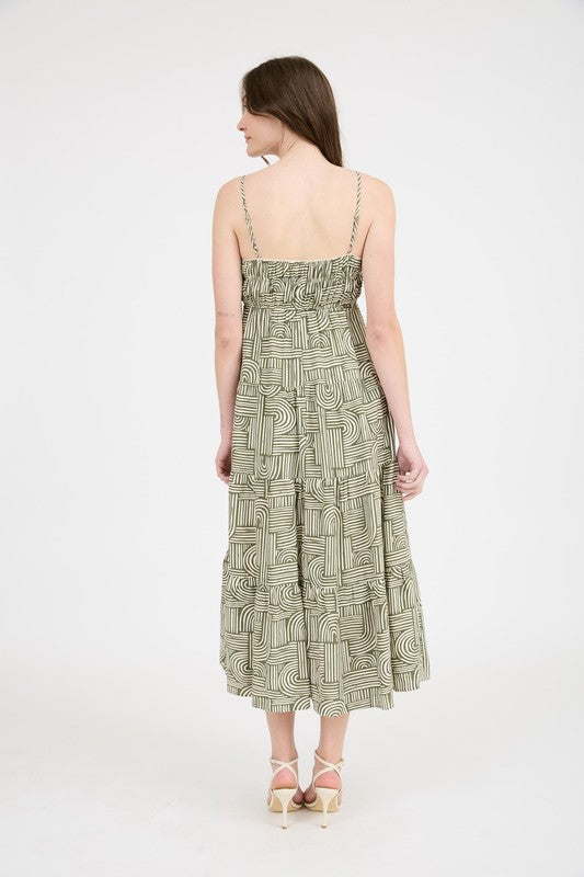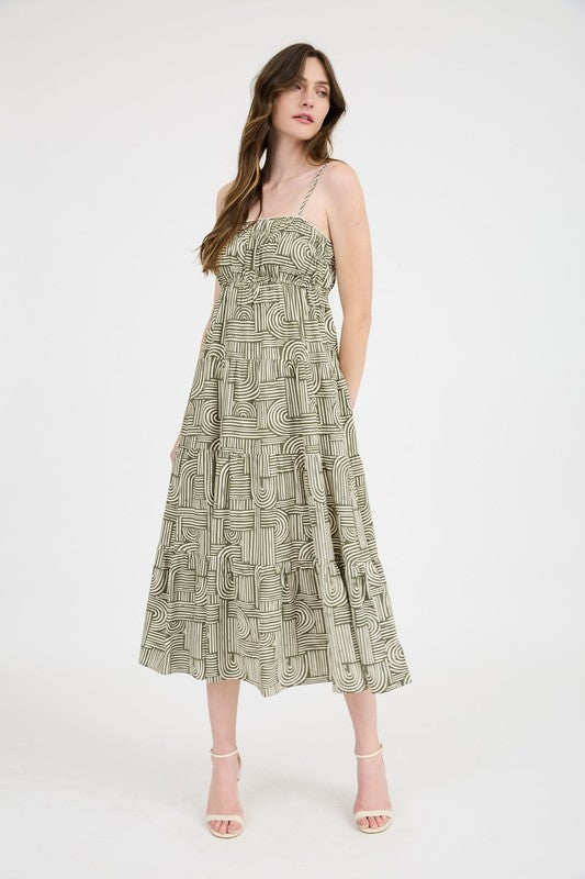 Blu Pepper Abstract Print Empire Waist Tiered Midi Dress, Olive