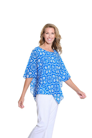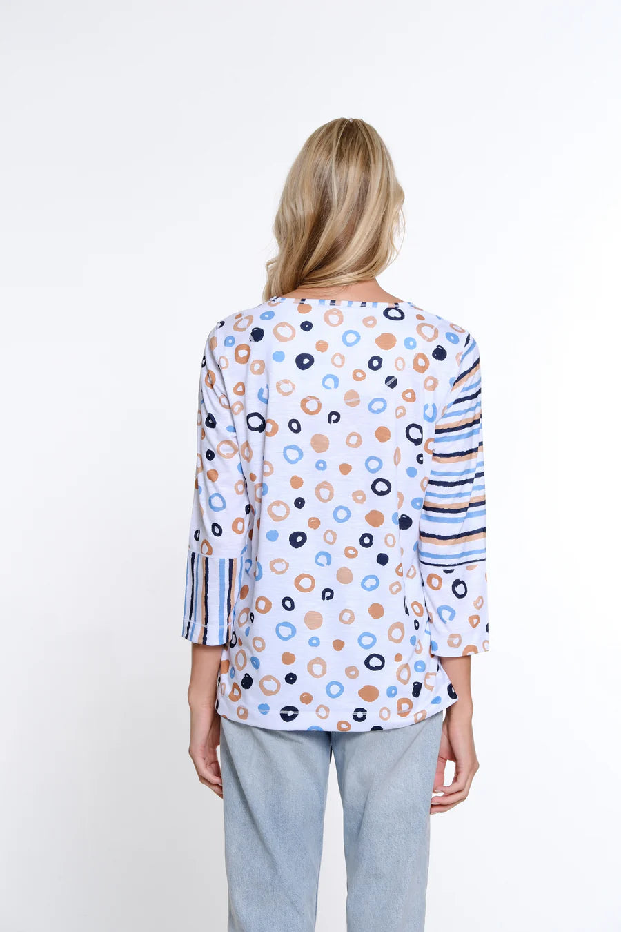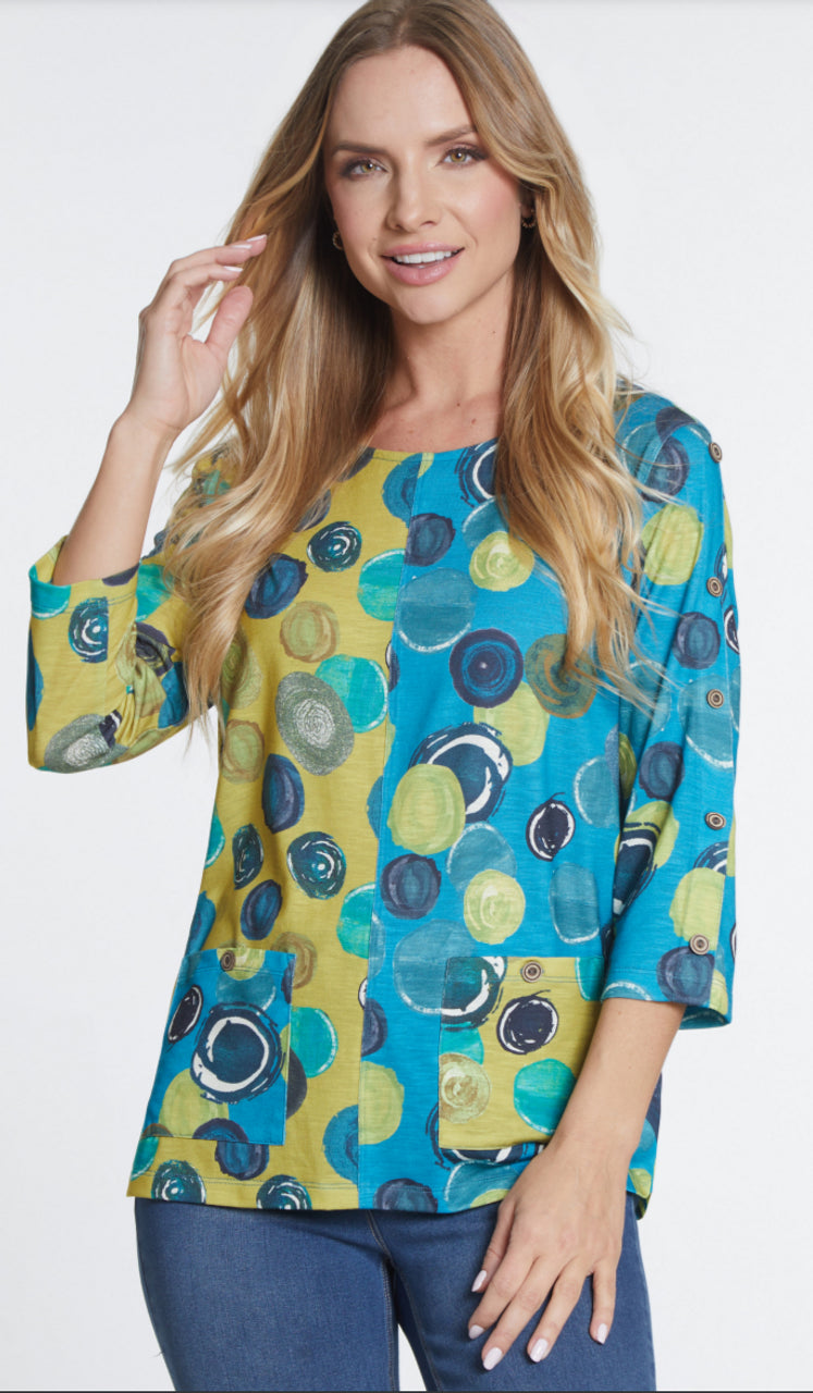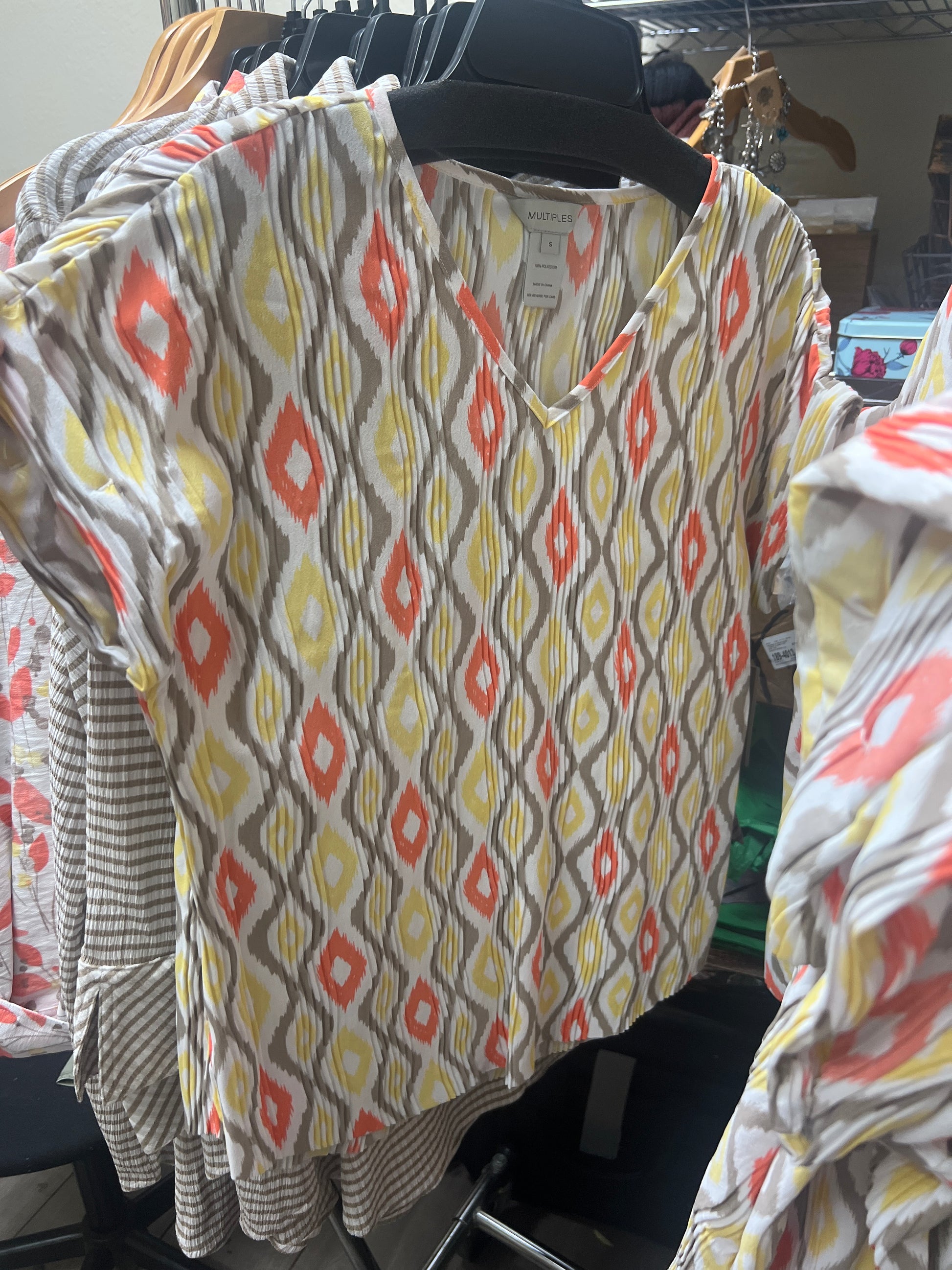 Multiples Pleated Flounce 3/4 Sleeve Y Neck Top