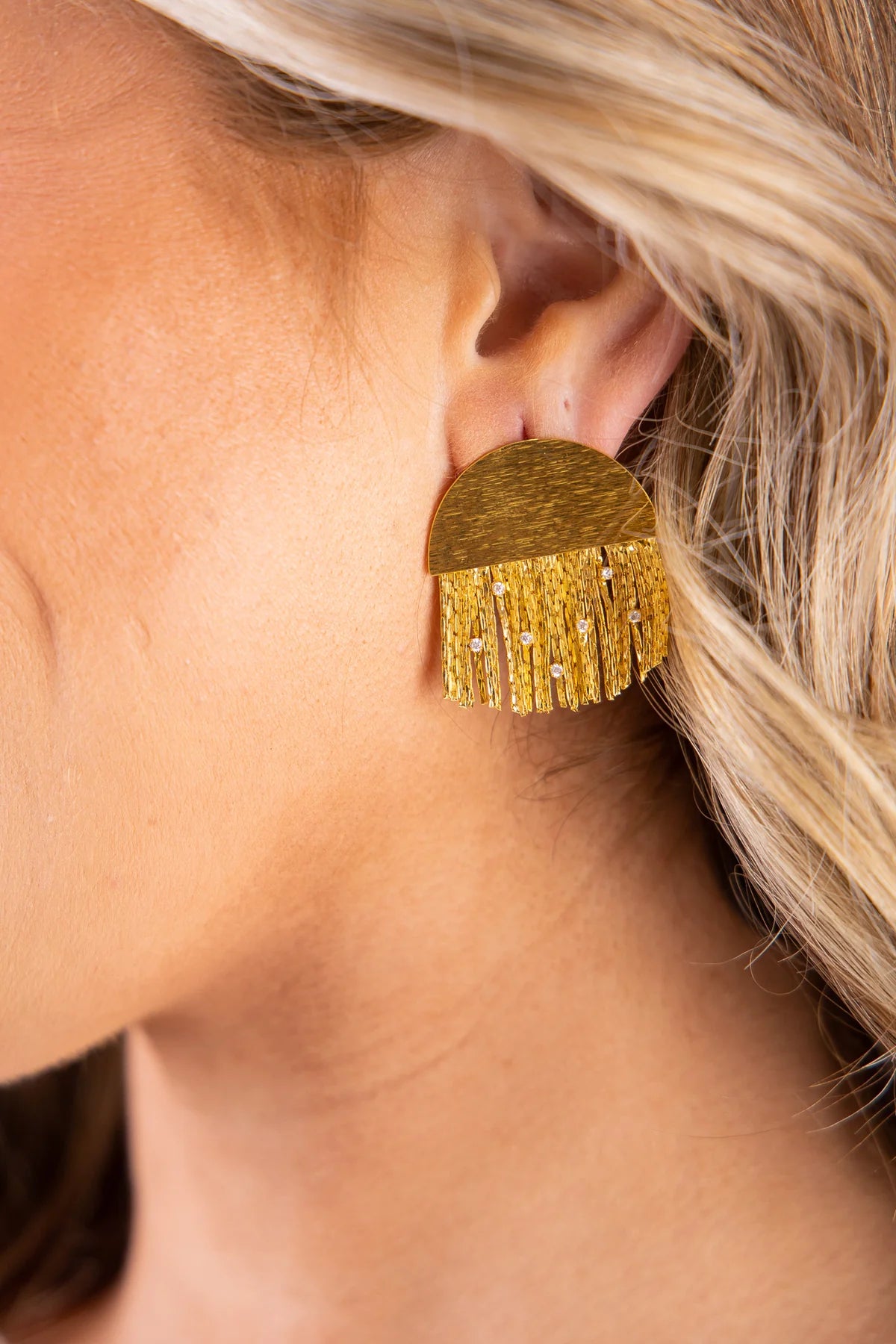 The Fergy Earrings by Bracha will add a touch of glamour to any look. Crafted in a brush gold finish and adorned with a gold fringe and small crystals, they bring an elegant shine to any outfit. Style with casual or dressy clothes to complete your look.