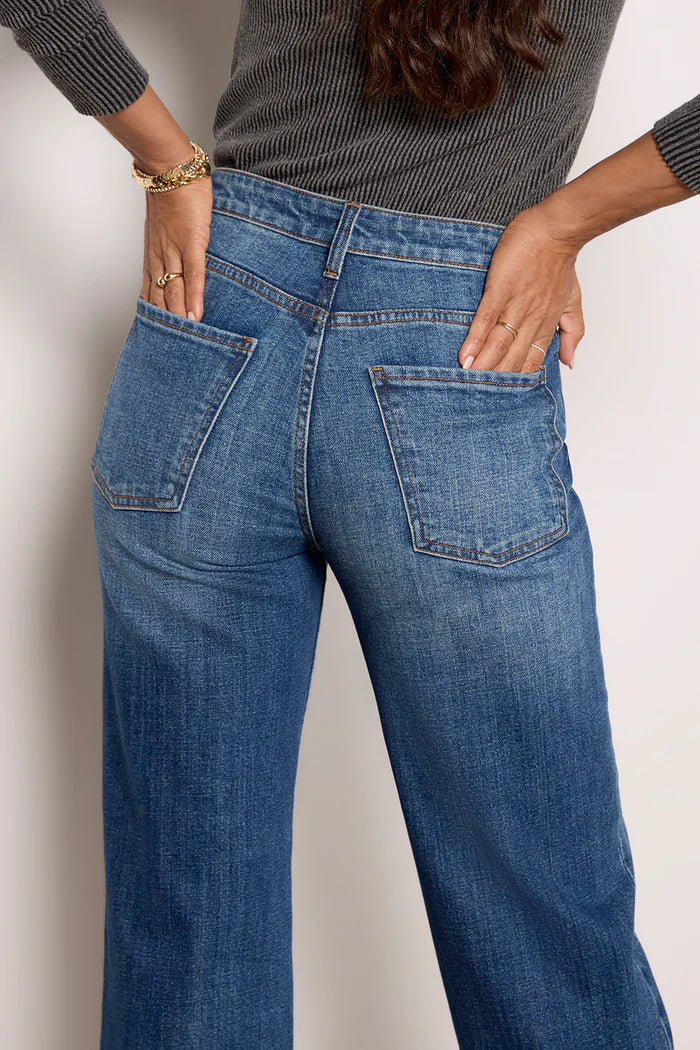 Top off your denim collection with the Sienna Wide Leg jean by Kut From The Kloth. Crafted in comfort-stretch denim with a classic blue wash, these versatile jeans feature a high-rise fit and relaxed full-length leg.