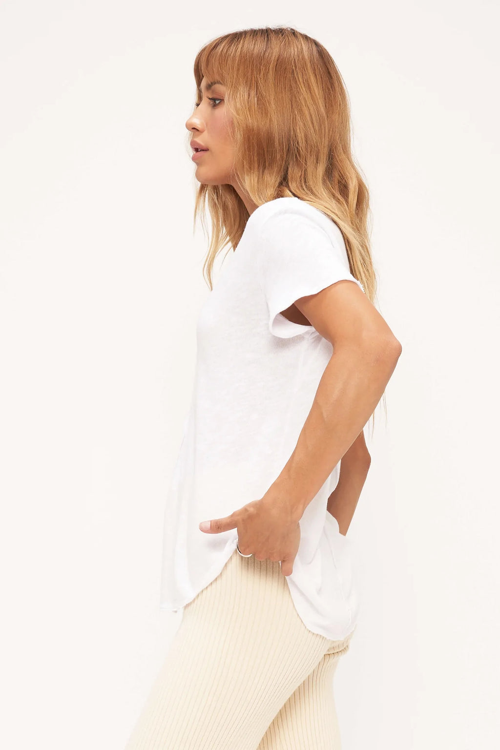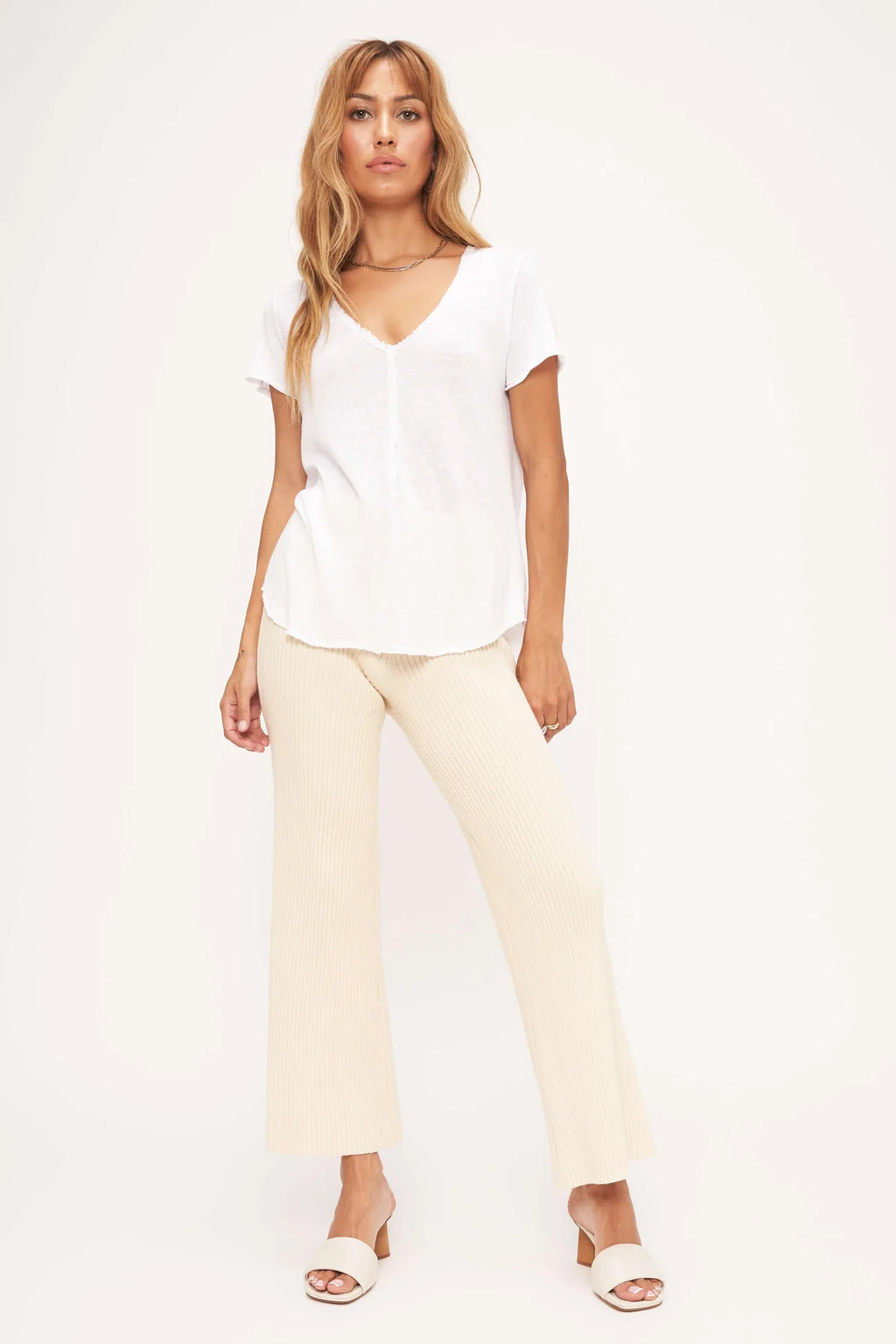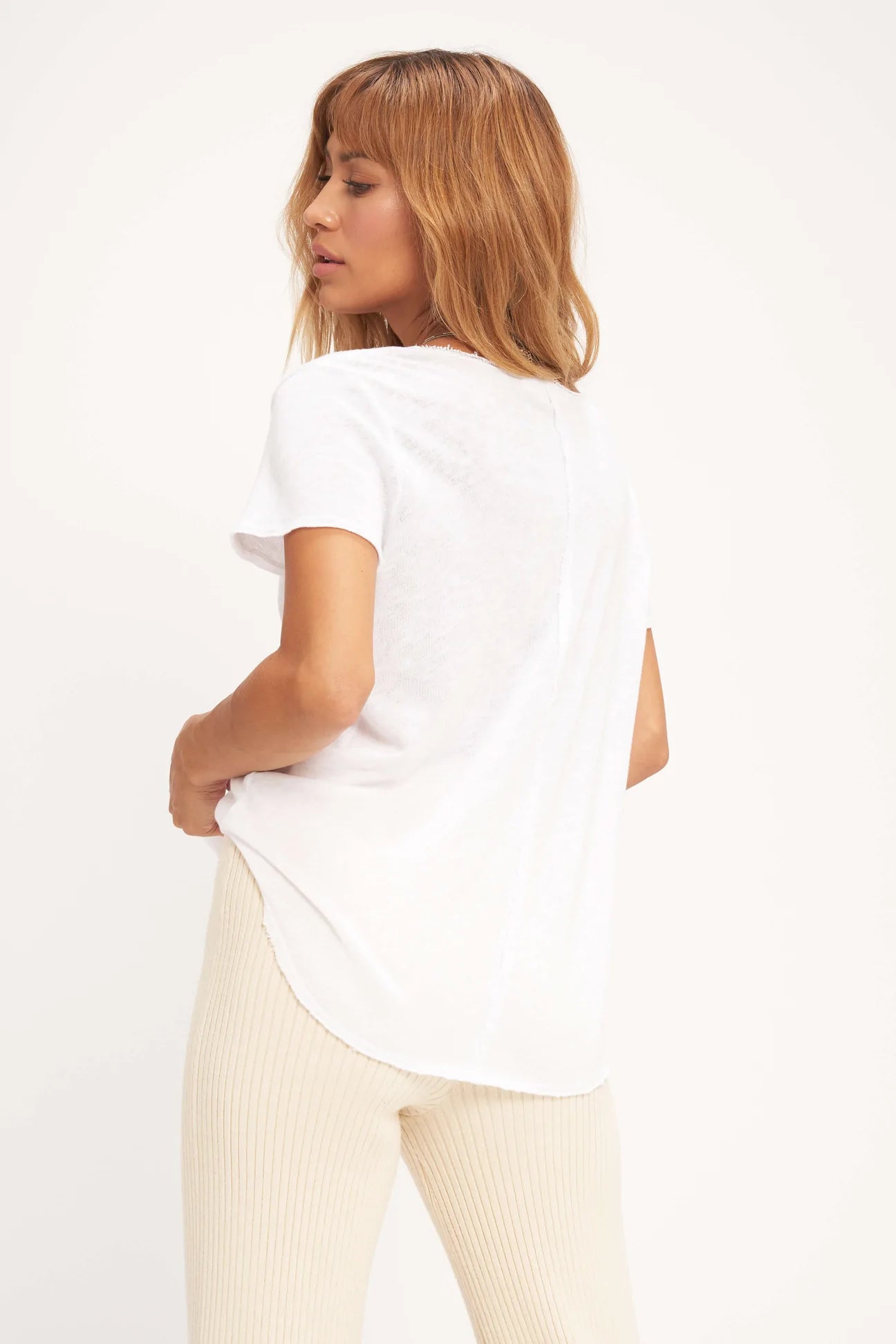 This always flattering tee has a relaxed fit, v-neckline and center seam detail. It is finished with raw edging throughout and a shirttail hemline.
